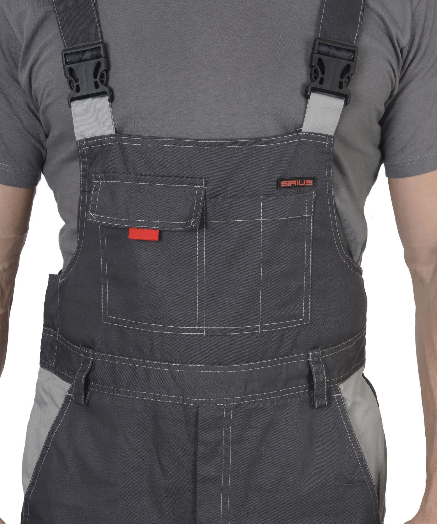 Мужской полукомбинезон. Декоративная двойная строчка контрастного цвета. Отделка контрастная на карманах и клапанах. Застёжка – молния спереди и пуговичная боковая. Регулировка спинки – частичная стяжка. Регулировка лямок – с помощью карабинов. Имеются пять накладных карманов: один на грудке, с клапаном и отстрочкой под инструмент, два больших объёмных боковых с косым входом, один сзади, один на брючине (клапан и отстрочка). Брючины оснащены наколенниками.